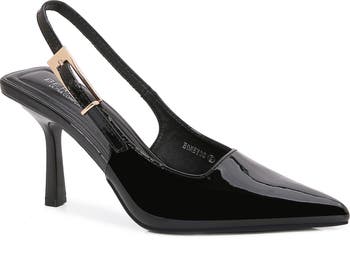 A rectangular buckle closure and pointy toe add refined dimension to this patent slingback pump set on a cushioned footbed and chic heel.