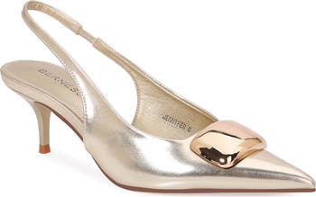 Let every step shine in this pointed-toe pump featuring an adjustable slingback strap and low kitten heel.