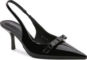 A dainty bow accent and pointy toe add refined dimension to this patent slingback pump set on a cushioned footbed and chic angular heel.
