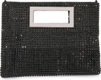 Rhinestones sparkle and shine on this structured clutch featuring a geometric inset handle and a removable chain strap.