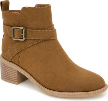 A polished buckle and wraparound strap define this side-zip bootie lifted by a stacked block heel.