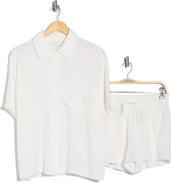 Perfect for cabana lounging, this cover-up set pairs a button-up shirt with a heart-patch pocket and matching shorts for easy, breezy style.