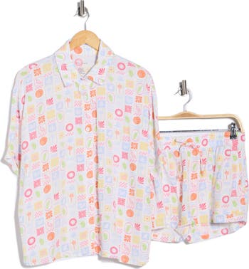 Perfect for cabana lounging, this cover-up set pairs a boldly patterned button-up shirt and matching shorts for easy, breezy style.