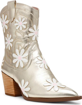 Floral appliqués add whimsical charm to a Western-inspired boot balanced by a pointy toe and stacked block heel.