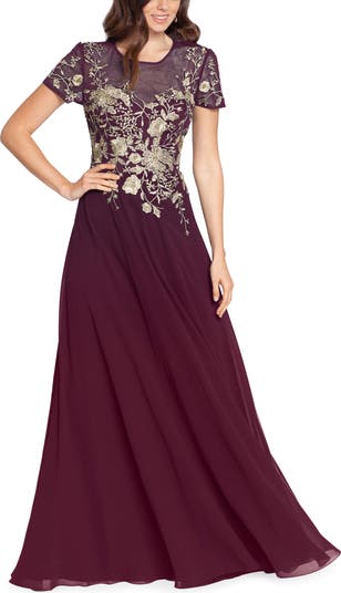 A gilded garden grows across the bodice of a fit-to-flatter gown that finishes with a full skirt in a wine-drenched hue.