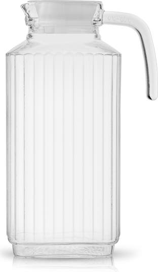 This textured glass pitcher with a plastic handle lid is perfect to keep at your bedside or serve homemade drinks at your next dinner party.