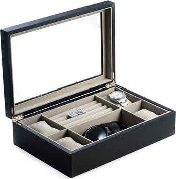 - - 4 watch pillows - Storage for rings and cufflinks - Color: black - 12.5" L x 8.25" W x 3.25" D - Imported Orders cannot be shipped to Canada, Alaska, Hawaii, Puerto Rico or P.O. Boxes