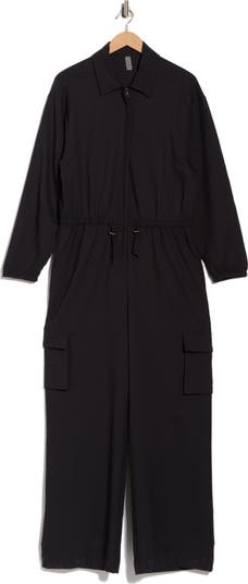 Set the trend in this long-sleeve jumpsuit fashioned with a drawstring-toggle waist and cargo pockets for utility-inspired style.