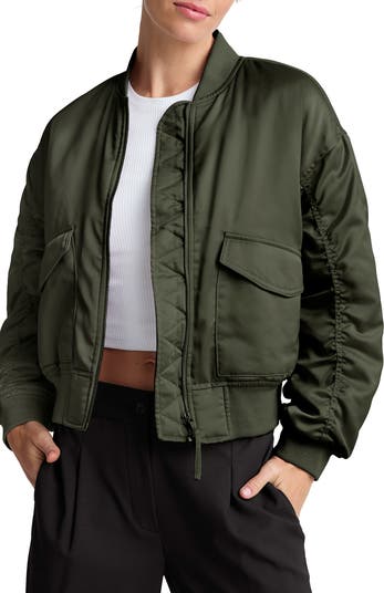 Shirring along the sleeves adds rich texture to a signature bomber jacket made from recycled fabric for a feel-good fit with every wear.