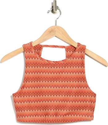 An open-back design and shelf bra support make this boldly patterned bra a versatile activewear essential.