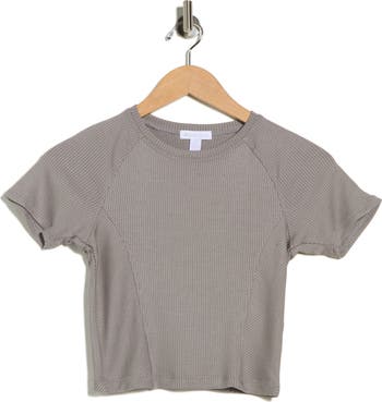 Flexible, compression fabric of this cropped t-shirt keeps up with your busy day of errands. Intersecting, rib-textured fabric adds flair to this casual top.