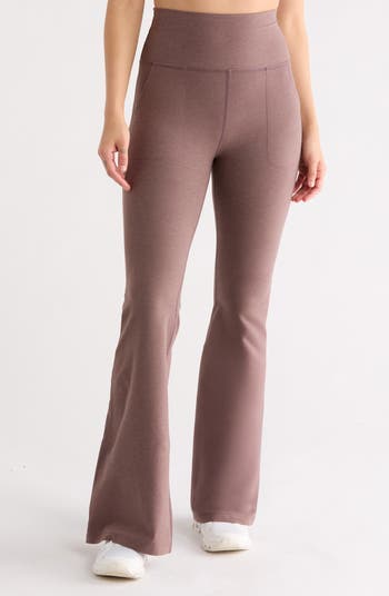 Shapely high-waist leggings are designed with blurred space-dye stripes and elongating flared legs.