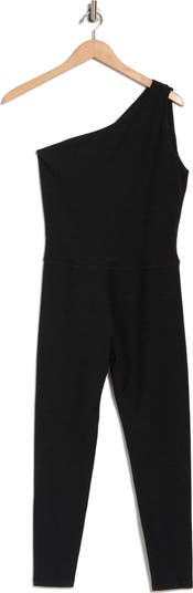 A one-shoulder silhouette enhances the sporty-chic vibe of this sleeveless yoga jumpsuit cut from stretchy performance fabric for easy movement.