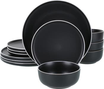 The elegant design of this versatile dinner set is defined by a matte finish and a bold contrasting border, complete with plates and bowls for four place settings.
