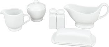 - Includes sauce boat, covered butter dish, salt and pepper shaker set, sugar bowl, creamer