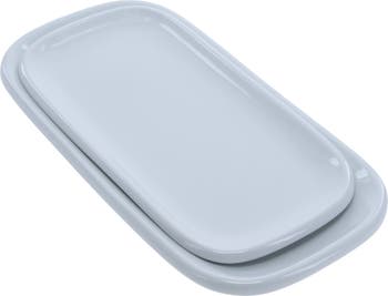A duo of rectangular platters crafted from high-quality porcelain boast a minimalist design that make them great for hosting parties or for everyday use.
