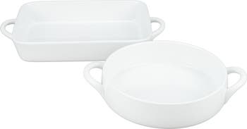 Bake sweet treats or whip up delicious side dishes with these elegant porcelain baking dishes designed with side handles for ease in and out of the oven or while serving.