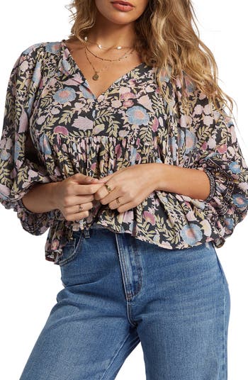 A flouncy ruffled hem brings swingy movement to this cropped top designed with delightful blooms and billowy sleeves.