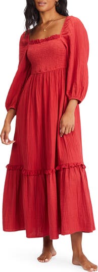 Breeze through your day in this comfy cotton midi featuring broderie anglaise ruffles, a smocked bodice and puffy three-quarter sleeves.