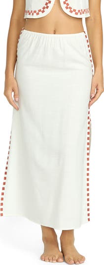 Embroidered squares highlight the slit sides of a cotton-blend skirt with a classic A-line silhouette.