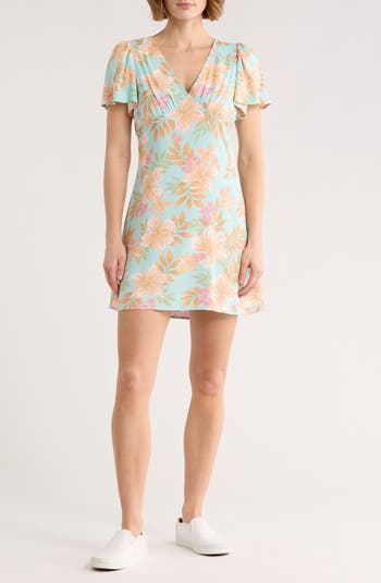 Tropical flowers brighten this Empire-waist minidress cut in a charming A-line silhouette framed by fluttery sleeves.