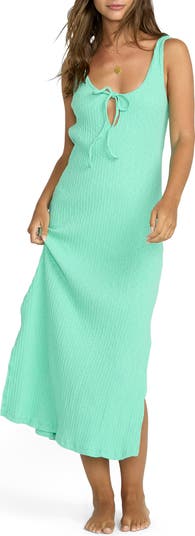 Embody a tropical lagoon in this beach-to-boardwalk midi dress knit in a variegated rib stitch in season-perfect hue. The scooped neckline featured a tied keyhole that unlocks the secrets to perfect sunny-day style.