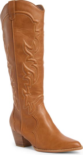 Ornate stitching and a curved topline define this Western-inspired boot lifted by a chunky angled heel.