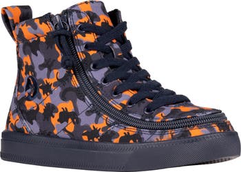 A clever wraparound zipper gives inclusive access to a high-top sneaker featuring a playful dinosaur-camo graphic print.