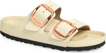 Oversized buckles plated in rose goldtone cinch the standout look of this patent-leather sandal, which has been an icon since its 1973 release. Birkenstock's legendary footbed offers time-tested comfort with biometrically molded EVA cushioning that absorbs shock and mimics the shape of a healthy foot, while pronounced medial and metatarsal arches support the instep and ball as you walk or stand.