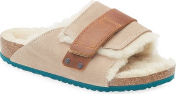 A kid-sized version of a classic sandal gets a cozy update with a genuine-shearling lining for cushioning and natural moisture-wicking comfort. The brand's signature contoured footbed supports kid's growing feet with a roomy toe box that allows toes to stretch out and arch support for a steady foundation that encourages good posture.