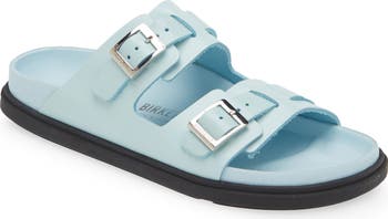 This sophisticated reinterpretation of Birkenstock's signature two-band slide sandal features soft premium leather straps and gleaming logo-etched buckles.
