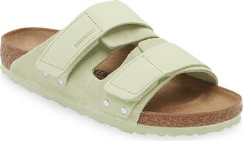 Grippy bone treads and a contoured cork footbed lend rugged grab-and-go comfort to a cushy slide sandal topped with a duo of adjustable leather straps.