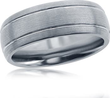 Polished stripes add contrast to a satin finished band crafted from tungsten and built to last.