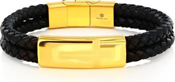 Stainless steel finishes add striking detail to a braided leather bracelet centered by a cross etching to add a display of faith in everyday outings.