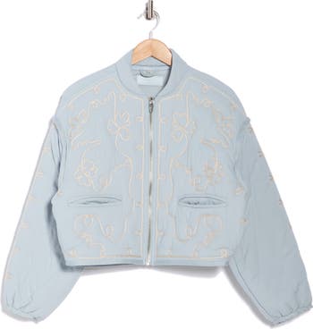 Swirling embroidery traces the quilted motif of this boxy, cropped bomber jacket cut from crisp cotton.