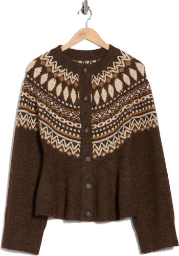 Metallic-flecked Fair Isle patterning brings whimsical charm to this buttoned cardigan with a peplum hem.