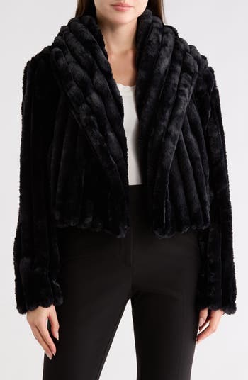 An abbreviated length lends modern appeal to a jacket constructed of plush faux fur to add a dramatic flourish to everyday looks.