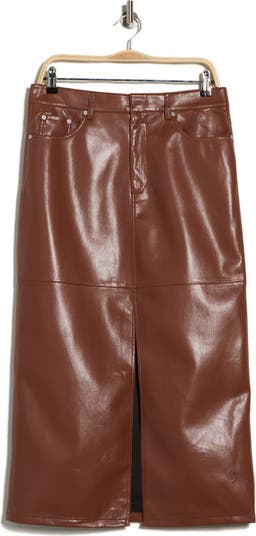 Perfect to dress up or down, this sleek faux-leather midi skirt is framed by practical pockets and an airy front slit.