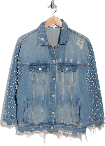Savage rips and sleeves dusted with a constellation of faux pearls put a fresh spin on this wardrobe-classic trucker jacket cut from rigid denim faded to old-favorite perfection.