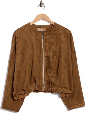 Elevate your wardrobe with this ultrasoft faux-suede jacket fashioned in a slouchy silhouette framed by a bubbly hem.