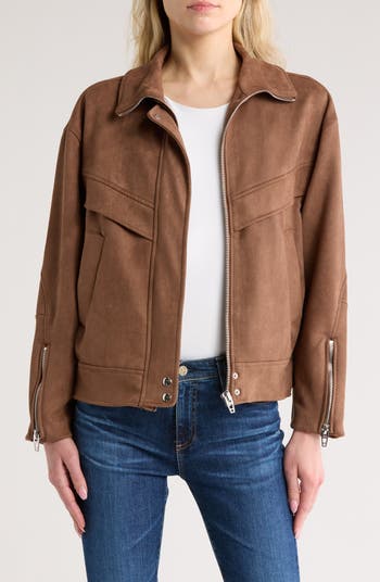 Layer on this soft faux-suede jacket constructed with a snap storm placket and secure zip pockets for sporty style.