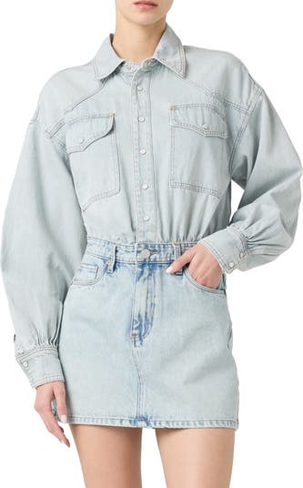 Make a casual-chic statement with the all-in-one ease of a nonstretch-denim minidress that gives the illusion of a matched shirt and skirt set.
