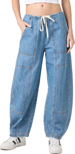 A low-rise drawstring waist and barrel-leg silhouette brings on-trend vibes to these carpenter-style jeans made from nonstretch denim in the perfect mid-blue wash.