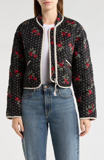 A lightweight layer for chilly days, this onion-quilted jacket is covered in a whimsical print and styled with practical front pockets.