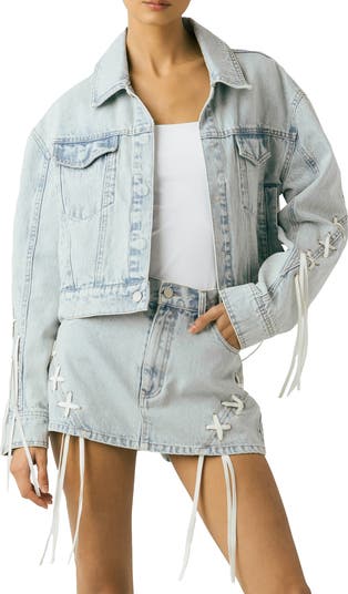 A slouchy silhouette and lace-up sleeves put a trendy twist on this snap-front denim trucker jacket that will be your go-to layer for casual days.