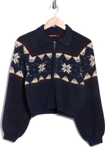 A Fair Isle pattern brings whimsical charm to this zip-up sweater framed by a collar and billowy sleeves.