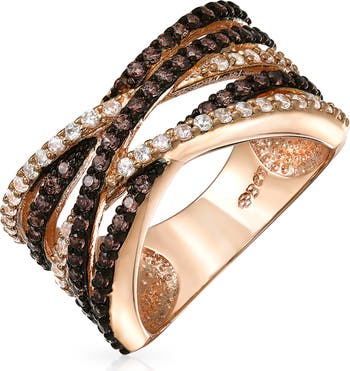 Tiny prong set cubic zirconias add a shimmering effect for a crisscrossed band ring.