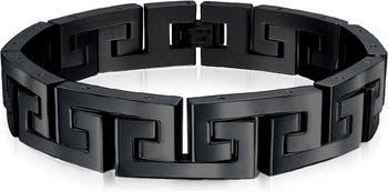 Show off this cool Greek key bracelet constructed from stainless steel with a black or goldtone finish.