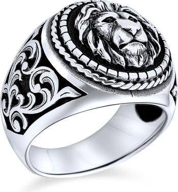 Show off bold style with this sterling silver signet ring featuring a dimensional lion framed by intricate filigree.