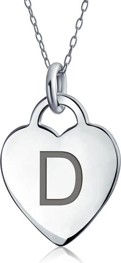 A classic sterling silver necklace features an initial heart shaped pendant.